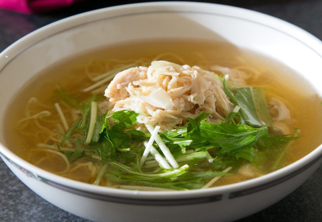 蒸し鶏と水菜のつゆそば(柚子胡椒添え)