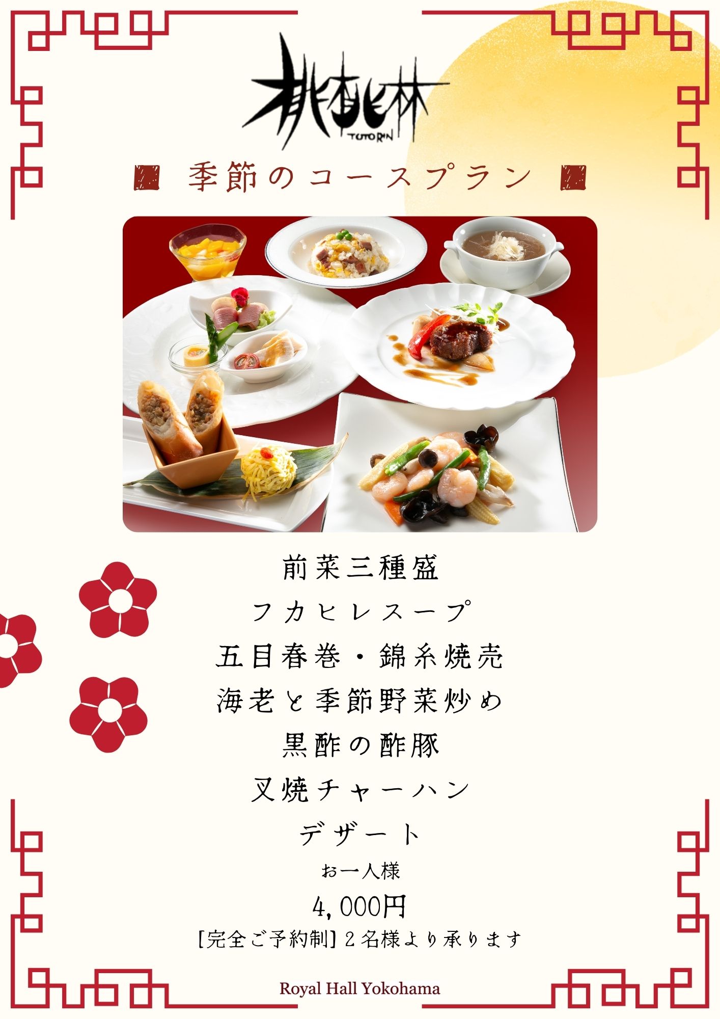 桃桃林 2025秋のコース ロイヤルホールヨコハマ桃桃林コースです 期間: 17:00より 予約制 季節の食材を使った 期間限定の新コースです! 満足していただける中華コースです ご家族、ご友人など 本格中華を、楽しみ下さい 予約制 2名様より賜ります