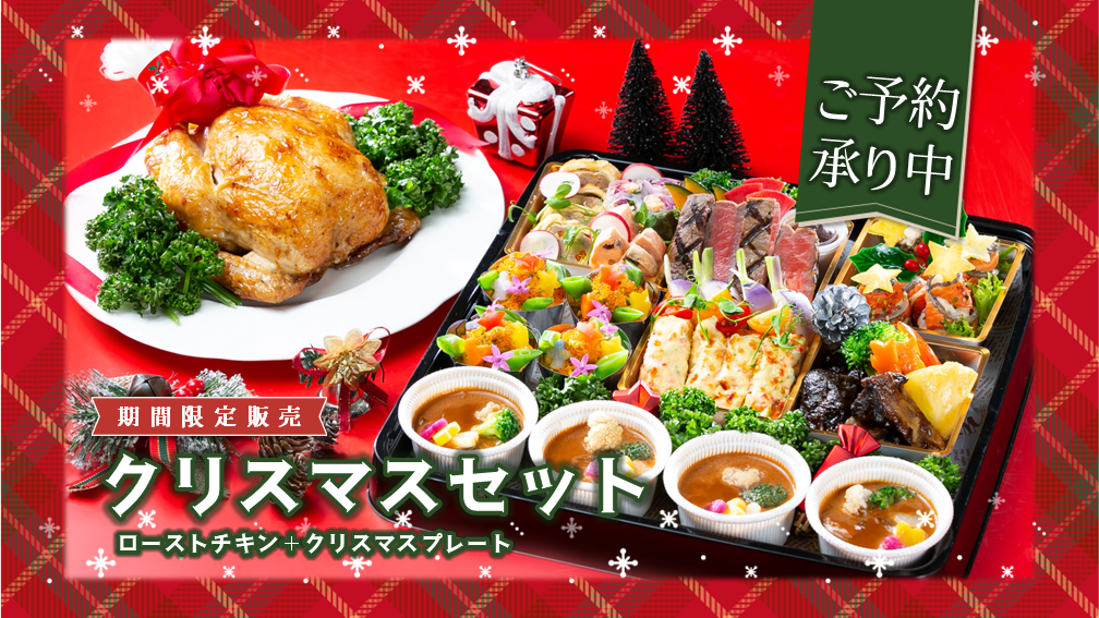 4名分のクリスマスプレートとローストチキンがセットになっております。
