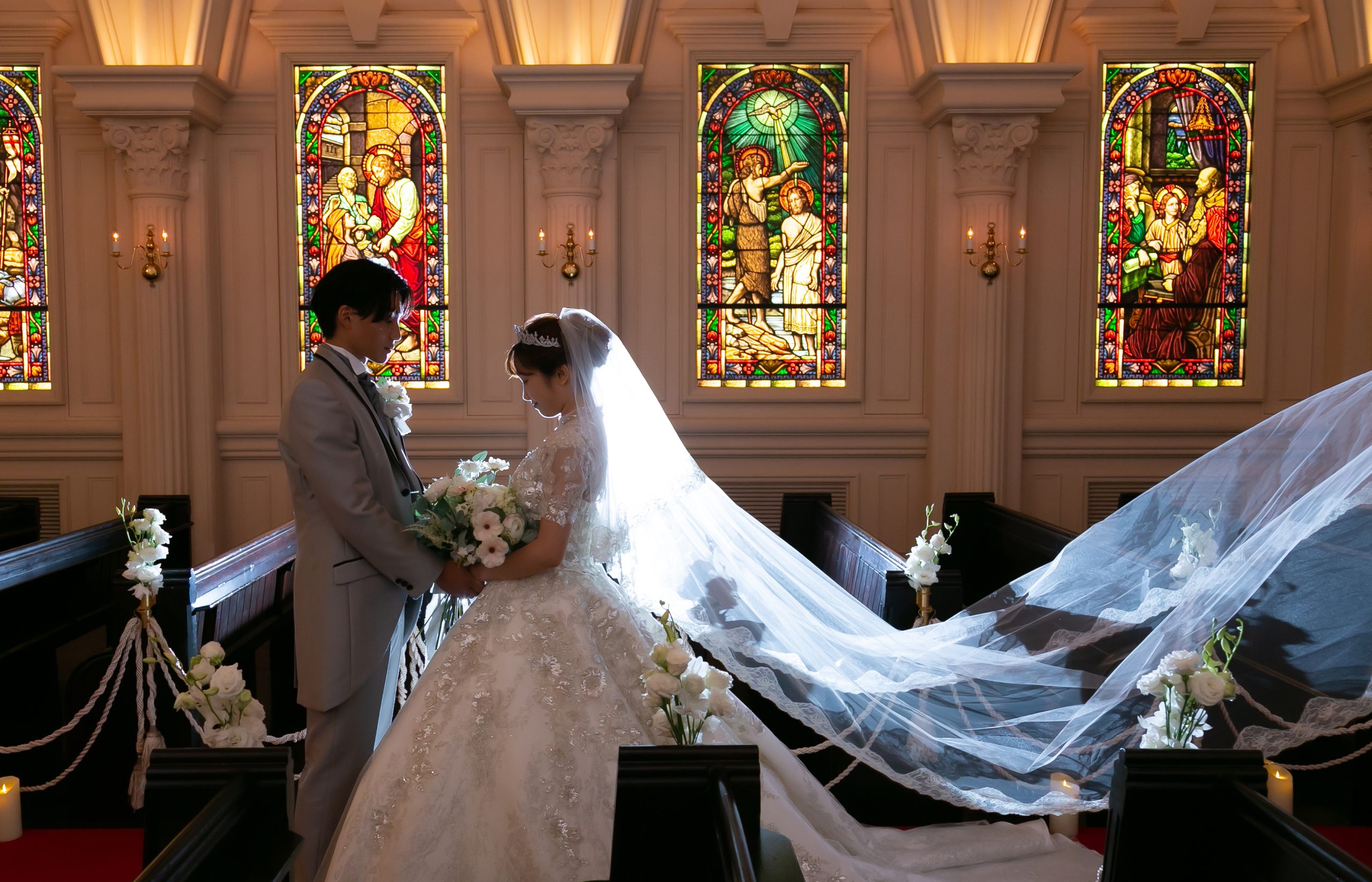 130年の歴史を超えた大聖堂に入場体験してみよう!調度品全てを本物のアンティークで揃えたクラシカルな雰囲気とステンドグラスの輝きが両親・ゲスト全ての人を感動へと誘う。※神前式が叶う神殿「出雲殿」も。